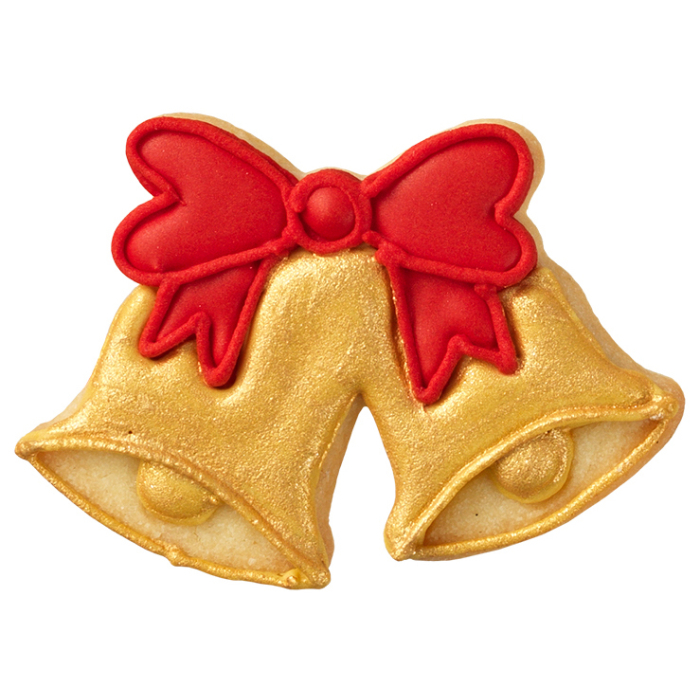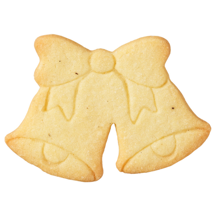 Ausstechform Doppelglocke mit Schleife, Größe: ca. 7,5 cm, aus Edelstahl mit Innenprägung, spülmaschinenfest.
