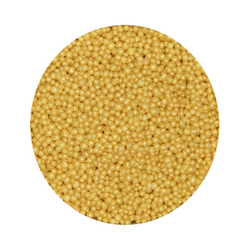 Streudekor Nonpareilles Gold, Größe: ca. 1,5 - 2 mm, Inhalt: ca. 65 g., Die klassische und bekannteste Art der Zuckerperlen mit einem schönen Glimmer-Effekt. Besonders geeignet zum Dekorieren und Verzieren von Pralinen, Petits Fours, Plätzchen, Muffins, Cupcakes, Cakepops u.v.m.., AZO-freie Farbstoffe! Farbabweichungen sind möglich !