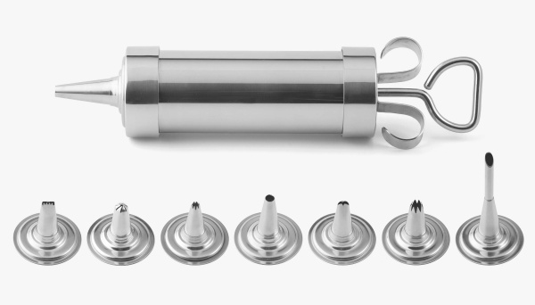 Länge: 24 cm, mit Bajonette-Verschluß, inklusive 7 unterschiedlicher Tüllen: Rosettentülle, Sternbandtülle, Blättertülle, Lochtülle, Sterntülle gross, Sterntülle klein, Fülltülle (für z.B. Krapfen füllen)